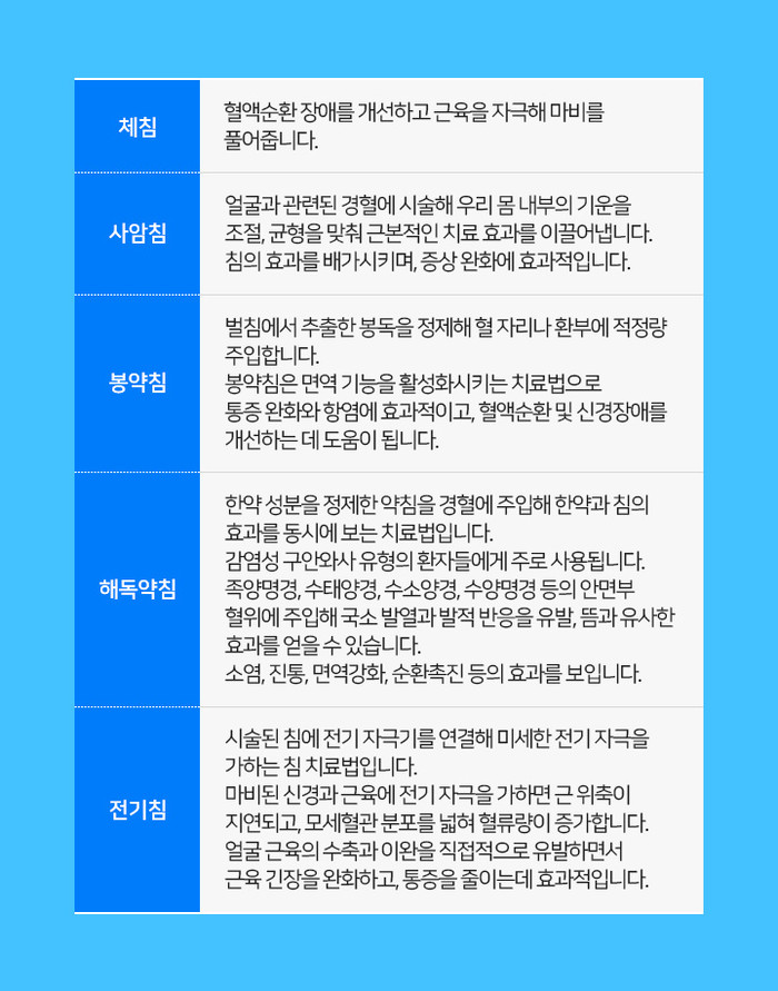 한방 치료: 침 치료, 약침, 한약 등을 통해 안면신경 기능 회복을 돕습니다.