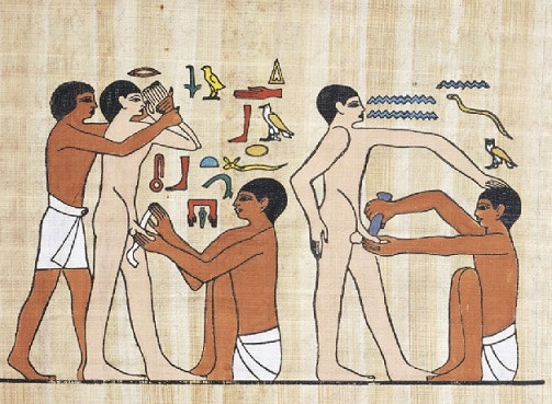 이 그림은 고대 이집트의 의학적 절차를 보여주며 포경수술이 어떻게 시행되었는지를 잘 나타내고 있습니다.